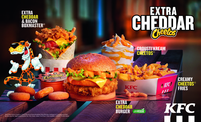 KFC’s new “Extra Cheddar Cheetos” lineup is a limited‑time collaboration that blends real Cheetos into burgers, wraps, sides, sauces, and even a dessert to create an ultra‑cheesy, pop‑culture‑driven menu experience supported by a full 360° marketing campaign.