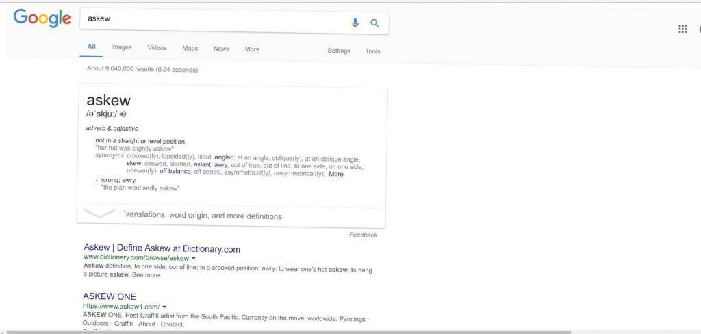 Search for ”askew” and the search engine will tilt the screen for you. This is one of the display Easter eggs that Google has. Everything else still works as it should and if you look for anything else the search results page will go back to normal.