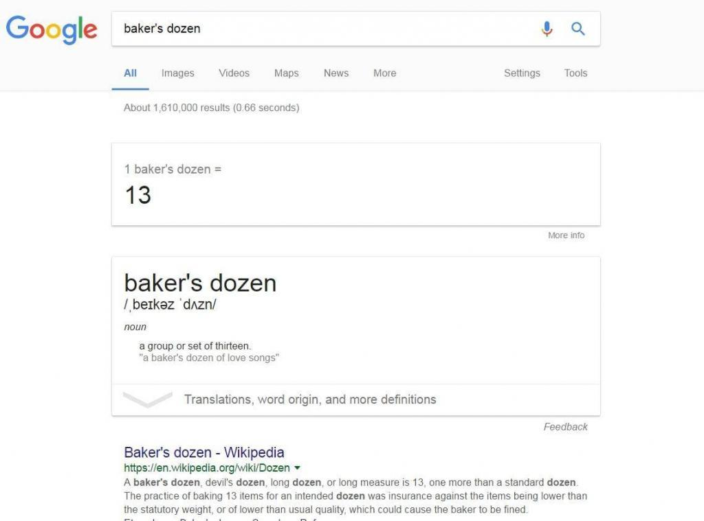 If you go to the search bar and look for “baker’s dozen”, you will see the number 13 on the calculator. A baker’s dozen, a long dozen or a devil’s dozen is 13 and this comes from the practice of medieval English bakers giving an extra loaf when selling a dozen. This represented an insurance against the items being lower than the statutory weight, or of lower than usual quality, which could cause the baker to be fined. The thirteen loaves where never called by the number and were described as a “baker’s dozen” because of the “unlucky 13”.