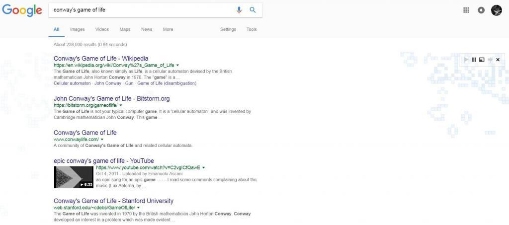 This is also among the nice Google Search Easter Eggs. Simply Google for “Conway’s Game of Life”, and you will see a few small blue boxes that move through different patterns and spread over the page. According to Wikipedia, The Game of Life is a cellular automaton devised by the British mathematician John Horton Conway, in 1970. The “game” is a zero-player game, meaning that its evolution is determined by its initial state, requiring no further input. One interacts with the Game of Life by creating an initial configuration and observing how it evolves or, for advanced “players”, by creating patterns with particular properties.