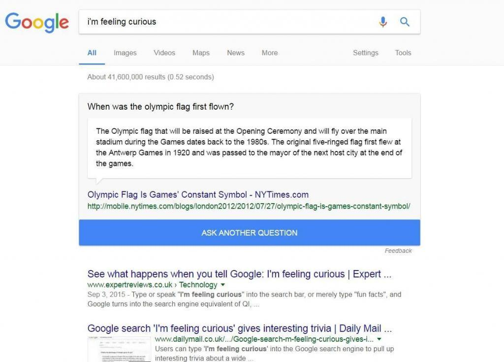 This one is pretty similar to fun facts. If you like trivia questions or you get bored, this is really useful. Google “I’m feeling curious” and the search engine will show you a random question and an answer that will teach you something new every single day. If you click on Ask Another Question, this will never stop. Did you know that the olympic flag was first flown at the Antwerp games in 1920?