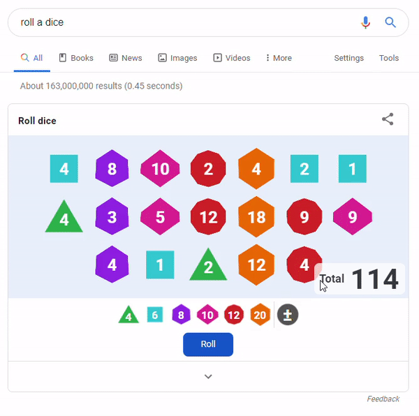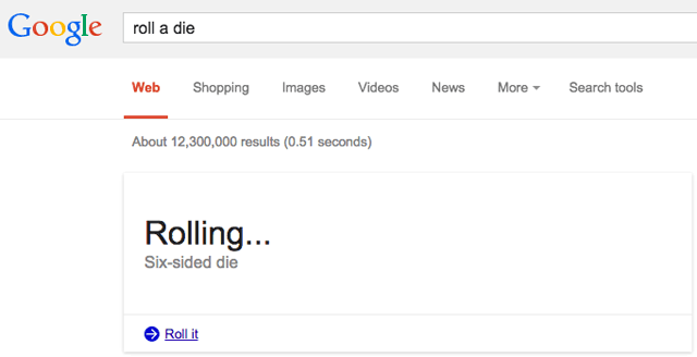 This is one that Google made for all the gamblers out there. All you have to do is search ”roll a die” or “roll dice” and the big G will roll a die for you, one out of six.