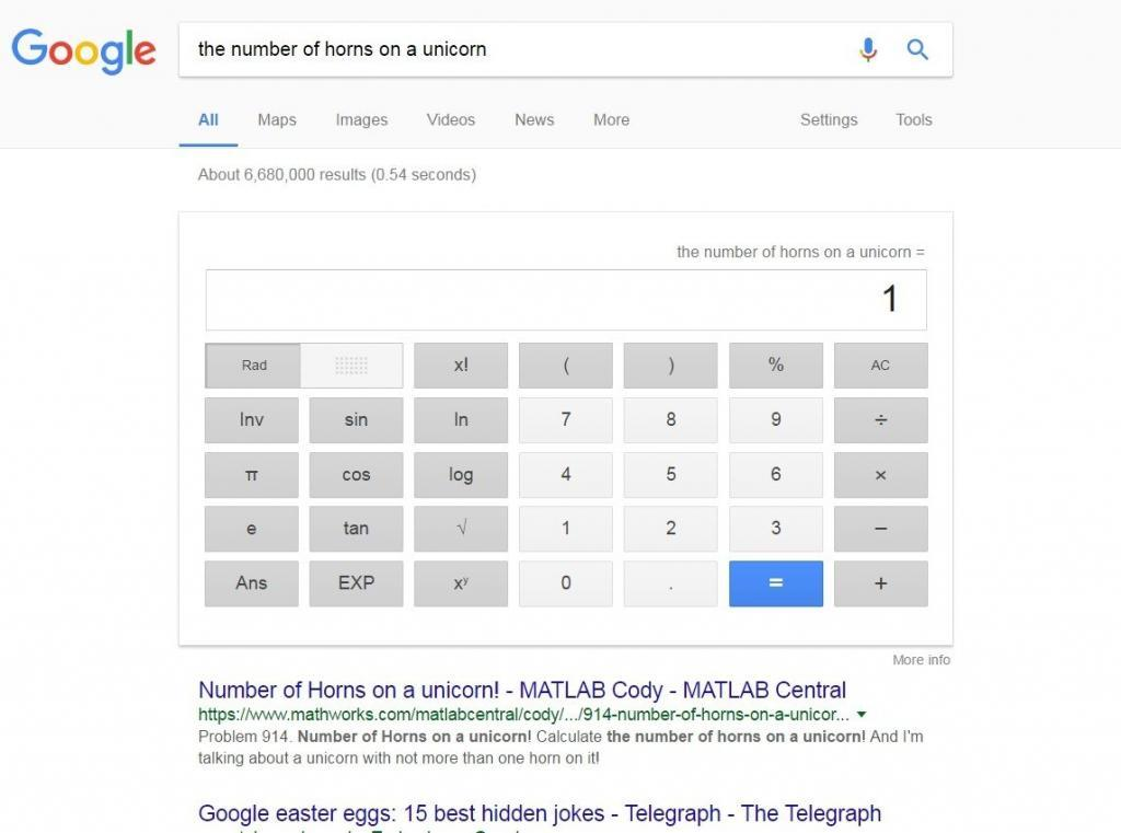 Similar to the Hitchhiker’s Guide to the Galaxy joke, look for “the number of horns on a unicorn” and the search engine will show you the calculator with the answer “1”.